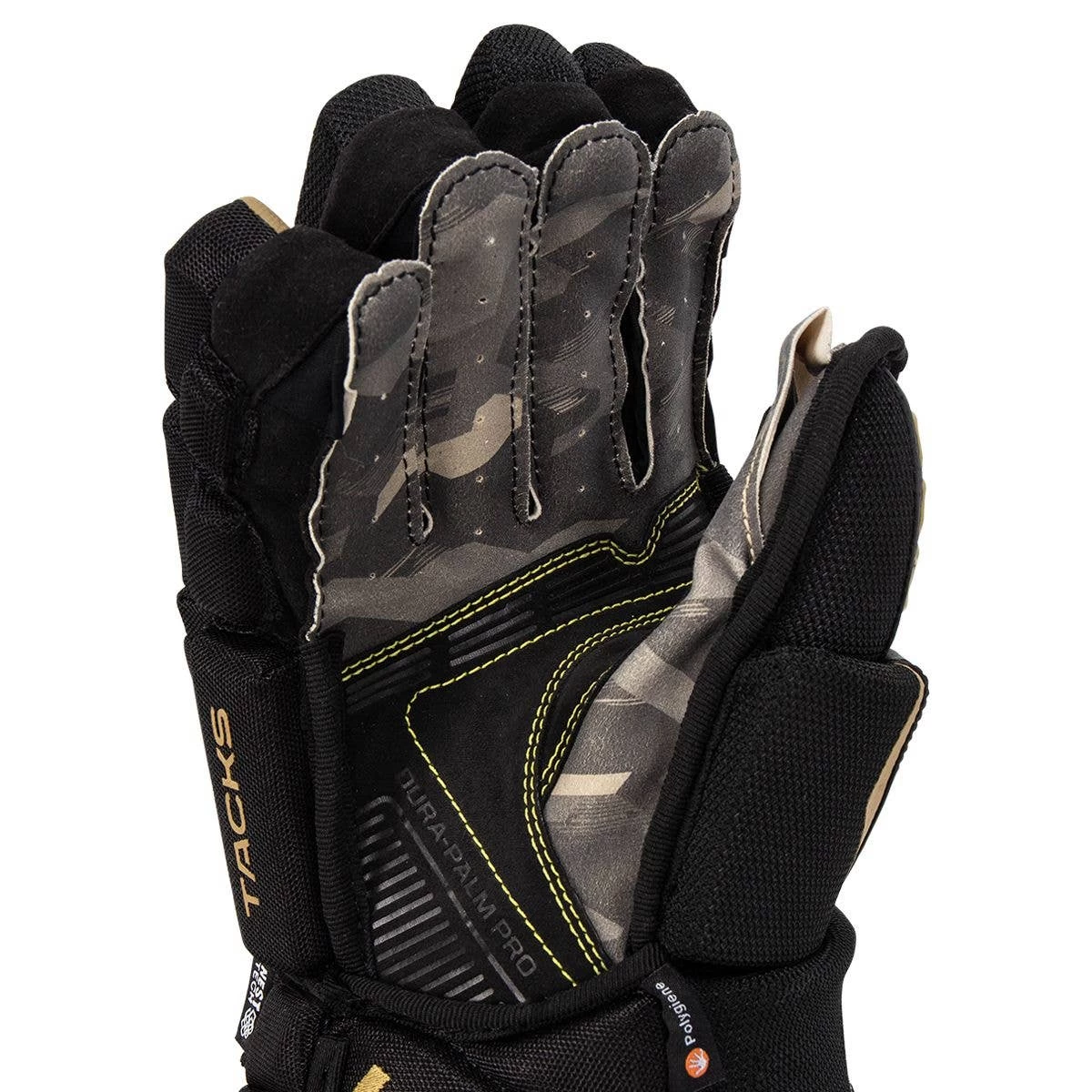 Continuing with the comfort aspect, the Super Tacks AS-V Pro Gloves feature CCM’s odor crunch treated dura-palm pro sublimated AX suede. This pro feel Ax suede palm is reinforced and has antibacterial polygiene and odor fighting treatments to help keep your hands comfortable and fresh with a durable grip. This palm provides extra durability to protect from the wear and tear caused by your hockey stick.